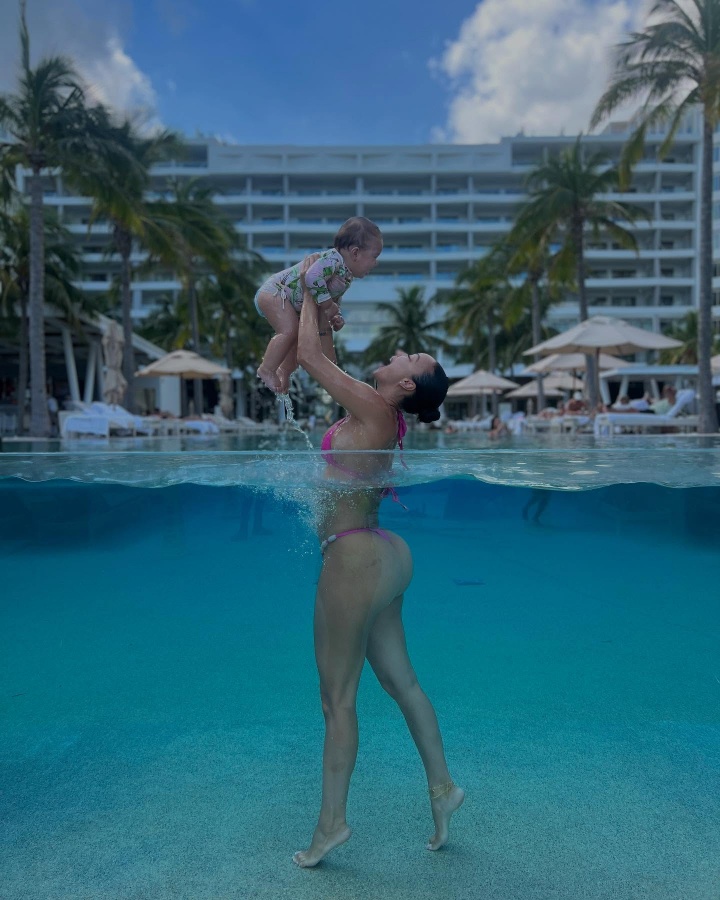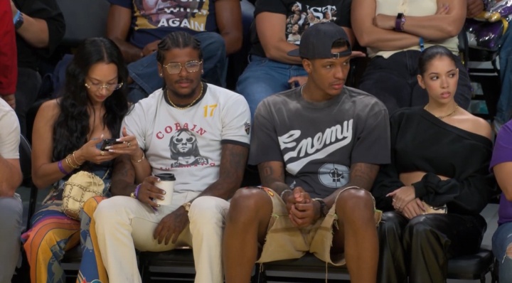太阳队球星杰伦-格林携40岁女友Draya,与前队友小贾巴里-史密斯及其伴侣共同现身场边观赛。